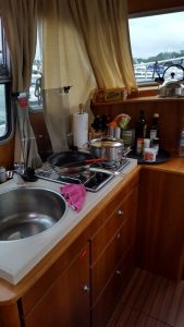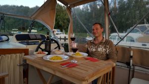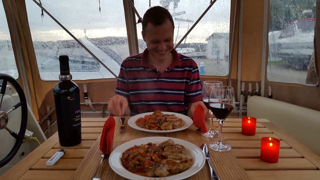 So verbrachten wir den Tag mit Hafentrunk, Lesen, Film gucken auf dem Bordfernseher (etwa von der Grösse eines Taschentuchs), Apéro und zNacht kochen – Schweinsfilet und Ratatouille… Mmmhhh. Dazu den obligatorischen Roten.