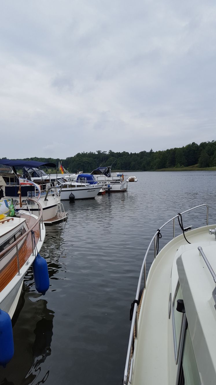 Leinen los, bei leichtem Regen durch den Stolp- Richtung Schwedtsee. Die Marina Fürstenberg erreichten wir schon 45 Minuten später. Der Regen hatte auch aufgehört. Antwort von unserer Charterfirma: wir sollen unter 1100 oder über 1600 Umdrehungen fahren. Ja nee is› klar.