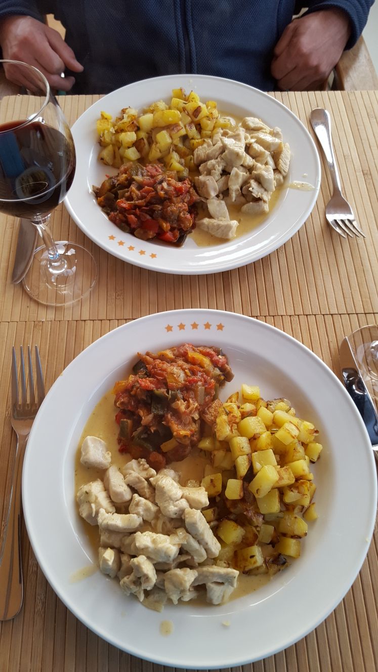 Selbst unsere «Pallas» sucht im Schilf Schutz vor Regen und Wind Zum zNacht bordgemachtes Pouletgeschnetzeltes an einer Rahmsauce mit Brathärdöpfeli und den Resten vom Ratatoille – mmmh lecker.